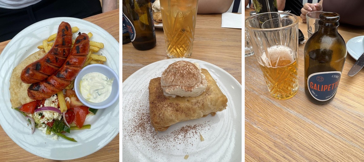 We've been back at the TheRealGreek, to try more of the menue. Of course we had to order Spinchpie again, it's simply the best. Or spinach parcels or how it's called. Then we had Peach Ice Tea again, and used our voucher for a fresh Greek Salad, with greek olives & bell peppers, that tastes like a summer day at the beach. We tried honey drizzled Halloumy Popcorn. Not only the name soundes like a dream come true. This was really delicious, but try for yourself. Then we had Greek Filo Custard Pie. On menue its listed with a scoop of vanilla ice cream. But with the pistacio hype going on, asked to get a pistacio instead, that was curtiously applied. Shout out to staff! It was such a treat! Just when you think it can't get any better. Baklava & Orangepie's position as favourite desserts are seriously in question. A true discovery. We also tried Ouzo, another first. So we can tick it off the list. Interesting. Only one thing is missing. The view onto the Mediterranean Sea.